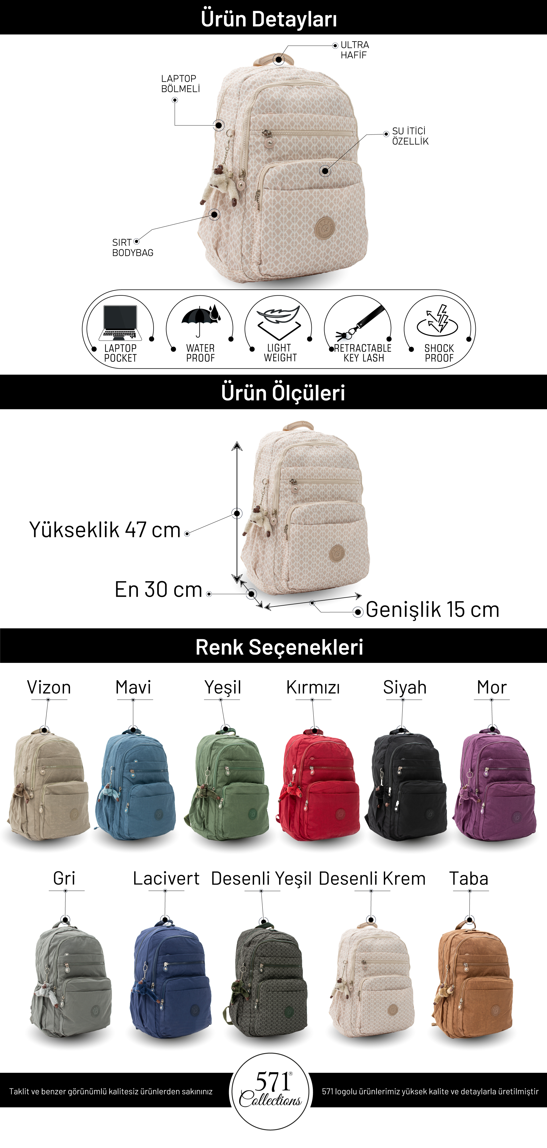 Ultra Hafif Çok Cepli Su Geçirmez Sırt Çantası Unisex Desenli Krem (Model: 571-1B) (571-1B)
